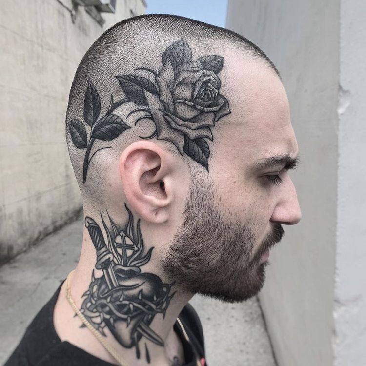 This look works wonderfully for men and women who keep their hair buzzed short or shaved. The detailed floral design stays visible while still feeling artistic rather than overwhelming. Among head tattoo ideas, botanical tattoos like this rose remain a favorite because they combine beauty, symbolism, and timeless style.