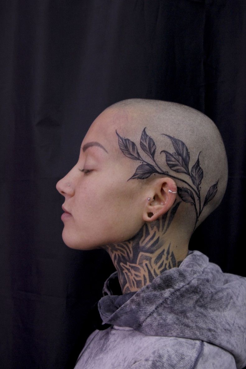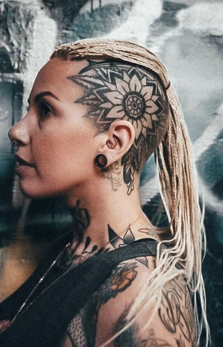 This style suits women especially well, particularly those who enjoy short buzz cuts or shaved styles. The placement allows the design to peek out when hair is short but remain partially hidden as it grows. In terms of head tattoo ideas, this one feels thoughtful and artistic rather than aggressive, giving off a calm, confident vibe.