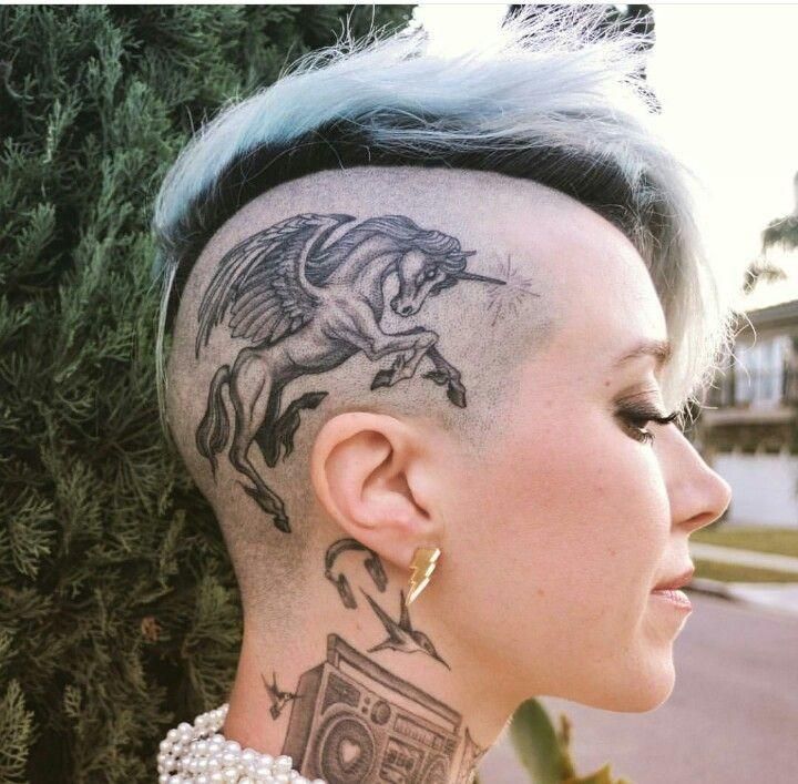 Animal tattoo ideas like Horse designs are loved for their symbolism of freedom and movement. This tattoo works beautifully for women who keep one side of their hair shaved while styling the top with volume or color. Among head tattoo ideas, mythical animal designs bring a powerful sense of individuality and storytelling.