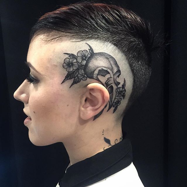 This design works beautifully for women who enjoy expressive tattoos that carry deeper meaning. The shaved section highlights the artwork, while longer hair on top can soften the overall look. Among head tattoo ideas, skull and floral combinations are loved for their balance between life, beauty, and transformation.