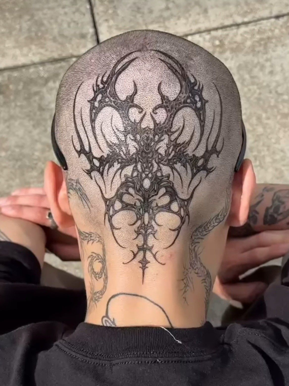 Intricate and almost architectural, this symmetrical blackwork tattoo spreads across the back of the scalp like an ornate crown. The detailed lines form a striking pattern that feels both dark and elegant. It’s the kind of design that rewards a closer look—every curve revealing a new layer of complexity.