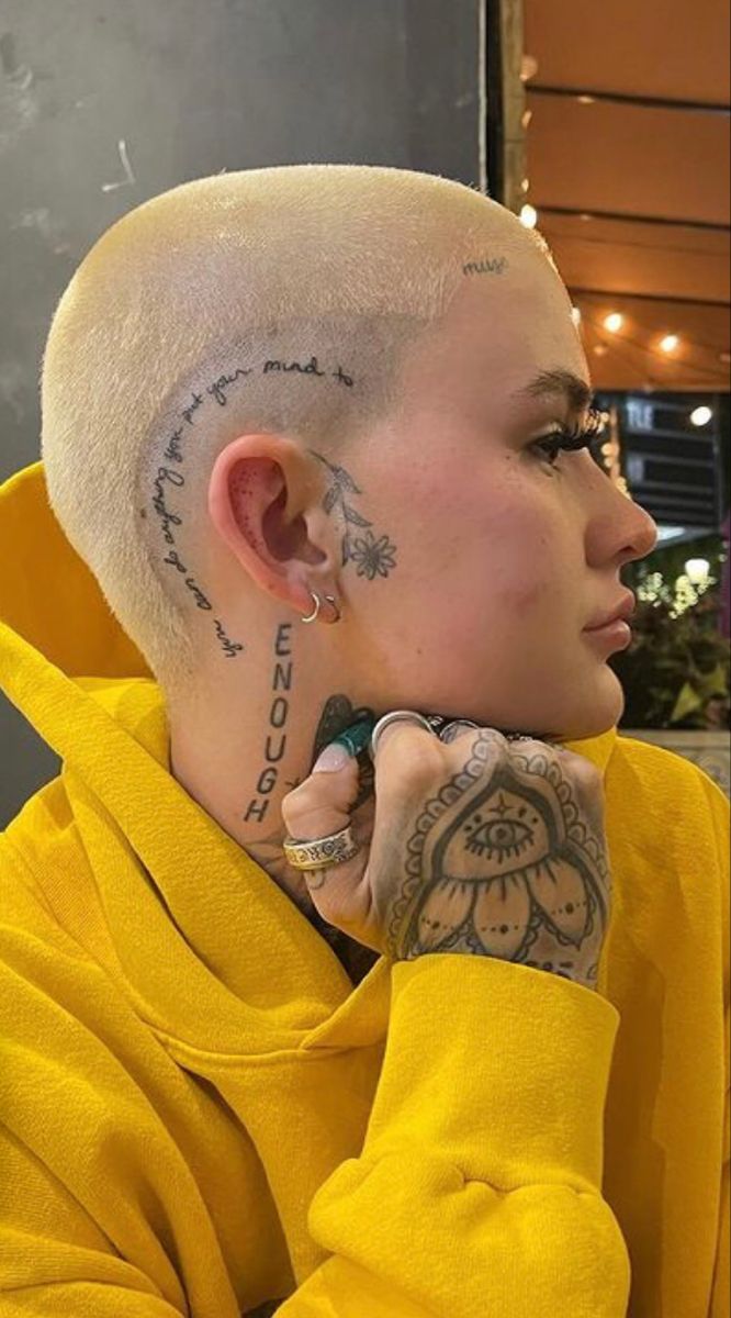 Lettering tattoos have become one of the most meaningful head tattoo ideas because they allow people to carry words that matter to them. This design works perfectly for women who prefer understated tattoos that still feel personal. With a close buzz cut, the lettering remains elegant and easy to maintain.