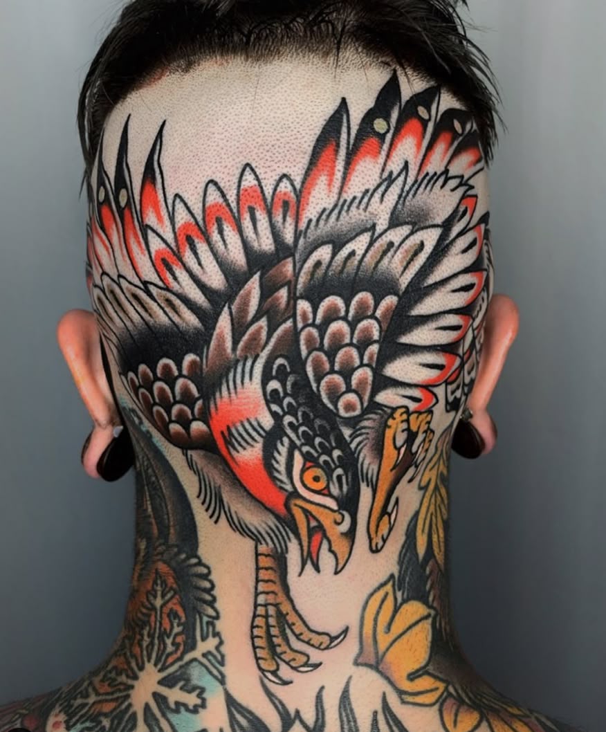 A bold Eagle spreading its wings across the back of the head carries a powerful presence. The strong lines, vibrant shading, and classic old-school style instantly give the tattoo that unmistakable traditional energy. It feels fearless, dynamic, and full of movement—almost as if the bird is about to take flight.