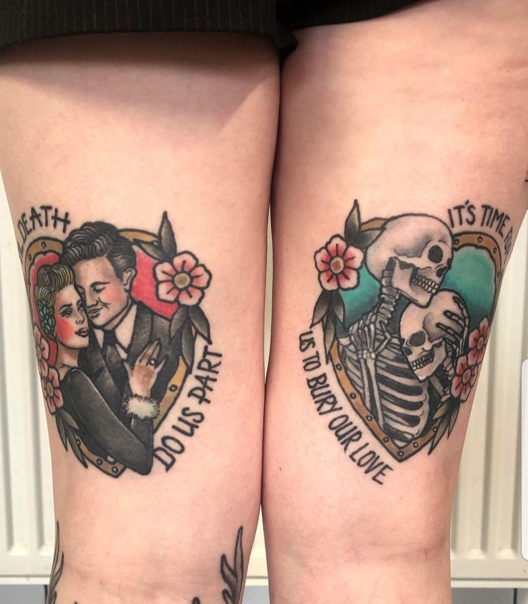 These designs, unique in emotional meaning, are perfect for couples who appreciate vintage tattoo culture and powerful storytelling. The saturated colors and strong outlines ensure the artwork remains striking for years, blending passion with permanence.