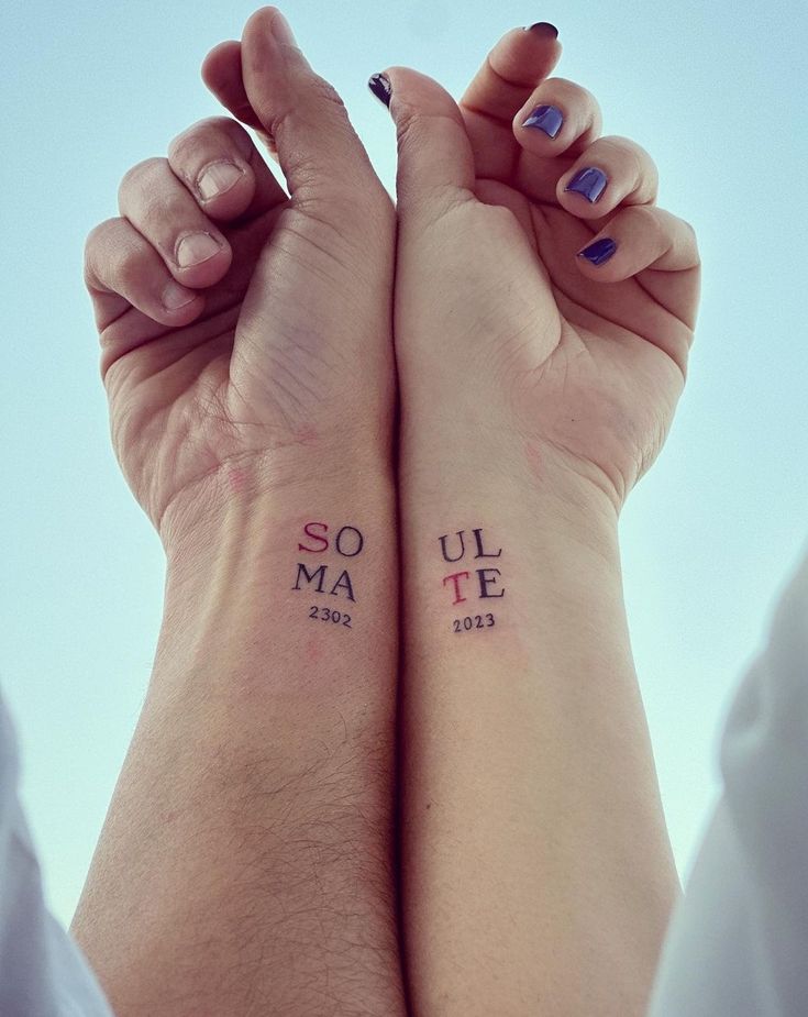 This minimalist, meaningful matching idea is perfect for couples who love subtle designs with emotional depth. The clean lettering keeps the look timeless, while the small placement makes it easy to live with through every season of life and style change.
