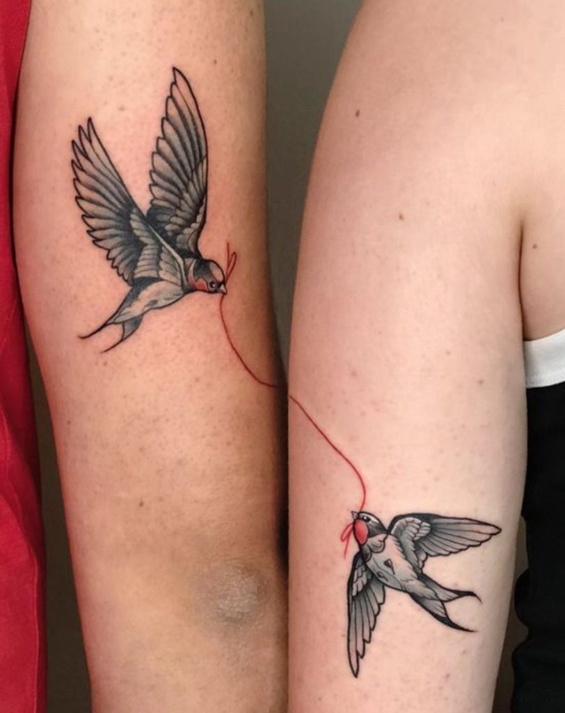 Light, hopeful, and full of motion, these flying swallows capture the feeling of finding each other across distance. The thin red thread tying them together adds a poetic layer—subtle, emotional, and unmistakably romantic. It whispers about destiny rather than declaring it, making the entire piece feel intimate and personal instead of dramatic.