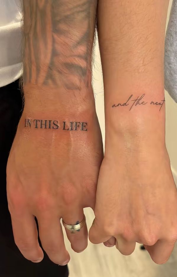 Script designs like this shine for couples who prefer subtle matching ink over visual symbols. The minimalist placement near the wrist keeps it refined and easy to live with daily, making it an effortlessly meaningful option that never feels overdone.