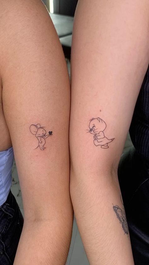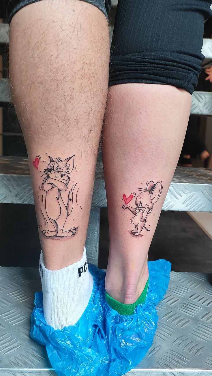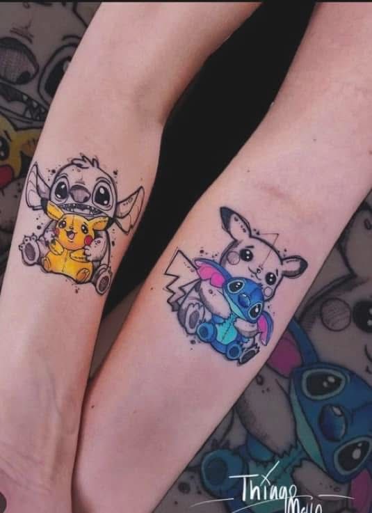 For couples drawn to aesthetic storytelling and emotional warmth, these small matching character tattoos feel both meaningful and unique. The bright palette keeps the mood light, while the compact scale makes them easy to place on forearms without overwhelming the skin or future style changes.
