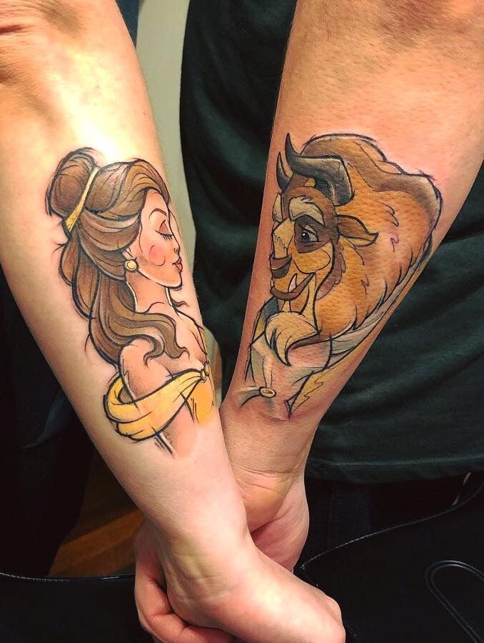 For couples who connect through shared stories and fantasy, these meaningful matching Disney tattoos offer emotional richness and visual beauty. The detailed style makes them true statement pieces while still celebrating timeless love.