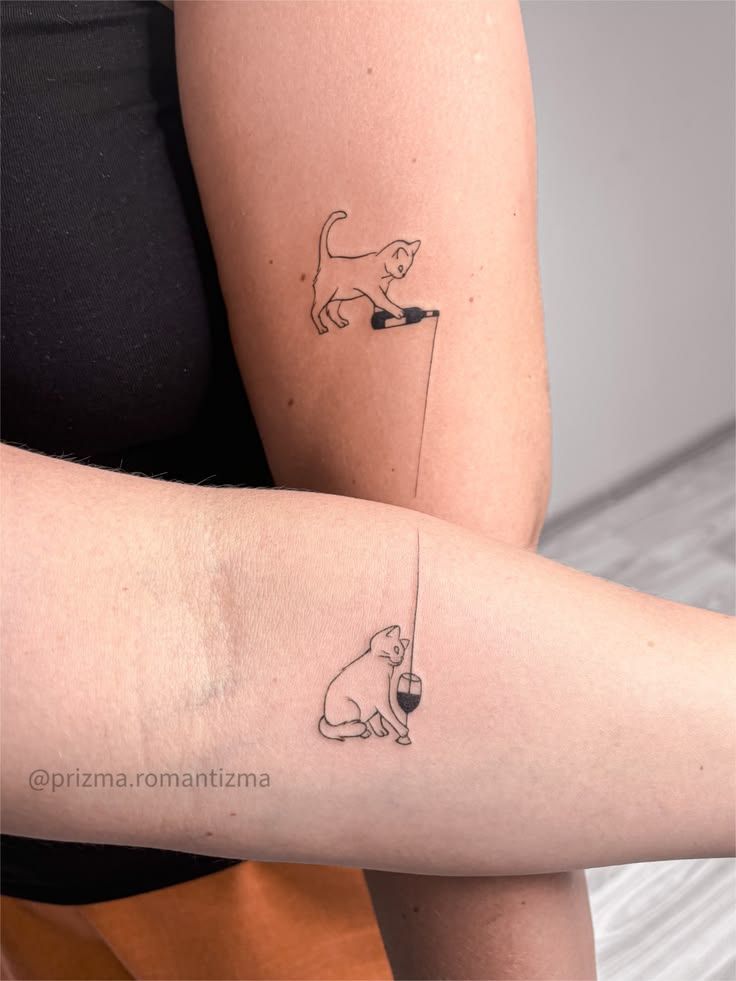 Dainty, fine-line tattoos like this appeal to couples who enjoy subtle storytelling and cute aesthetics. Their gentle simplicity keeps them versatile for many placements and lifestyles.