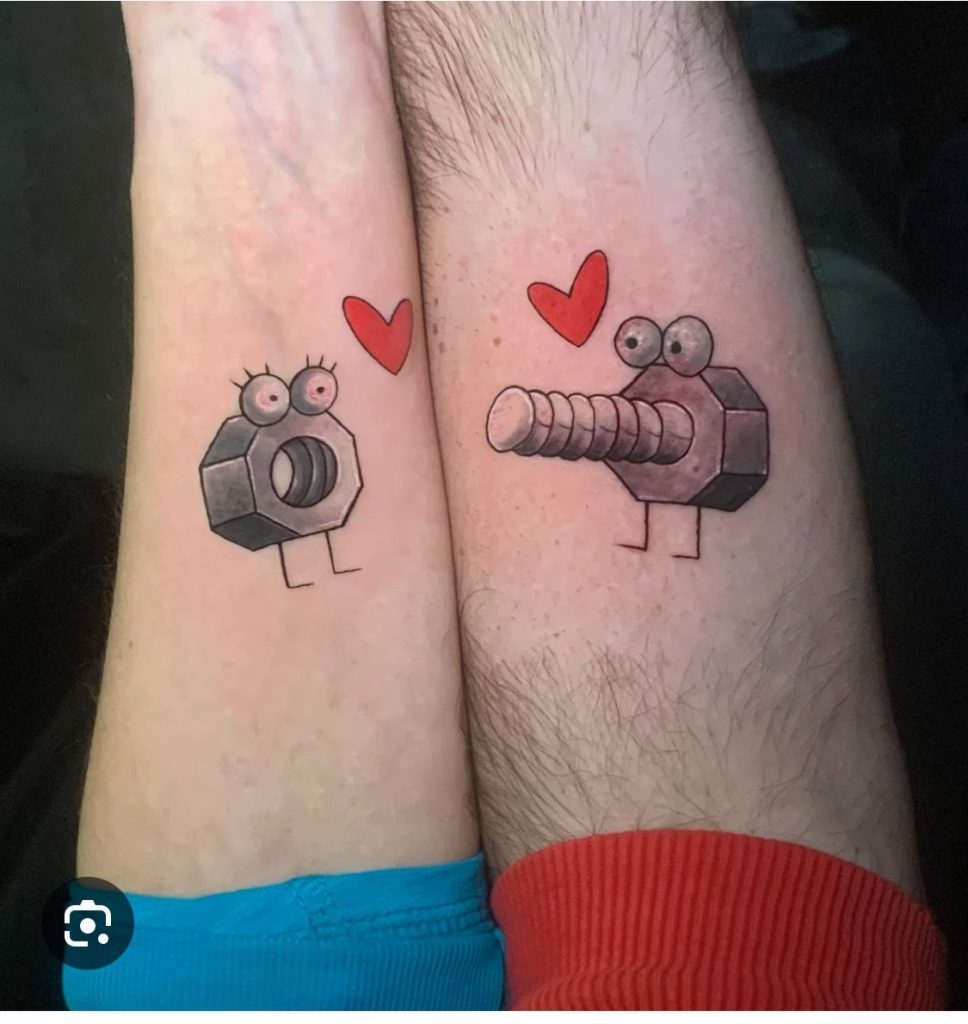 Playful, quirky, and impossible not to smile at—this charming nut-and-bolt duo turns mechanical parts into pure affection. The tiny hearts floating above them add a dose of humor that keeps the tattoo lighthearted rather than sentimental. It feels like inside-joke energy, the kind only two people truly understand.