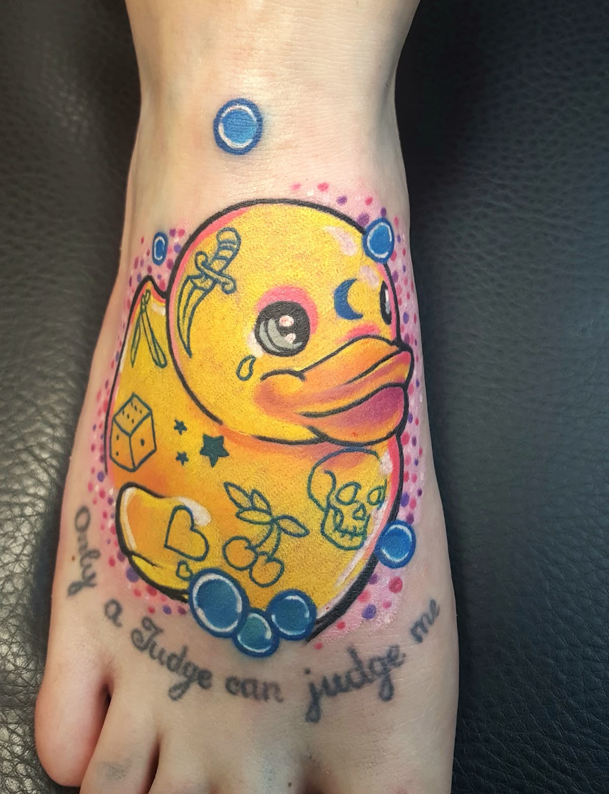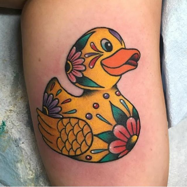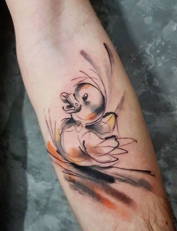 Now this is a Rubber duck that refuses to be subtle. The saturated yellow, punchy blue bubbles, and playful graphic details give it a loud, expressive personality. It feels almost pop-art inspired, with a slightly rebellious twist. Out of all duck tattoo ideas, this one absolutely demands attention—and honestly, sometimes that’s exactly the energy you want.