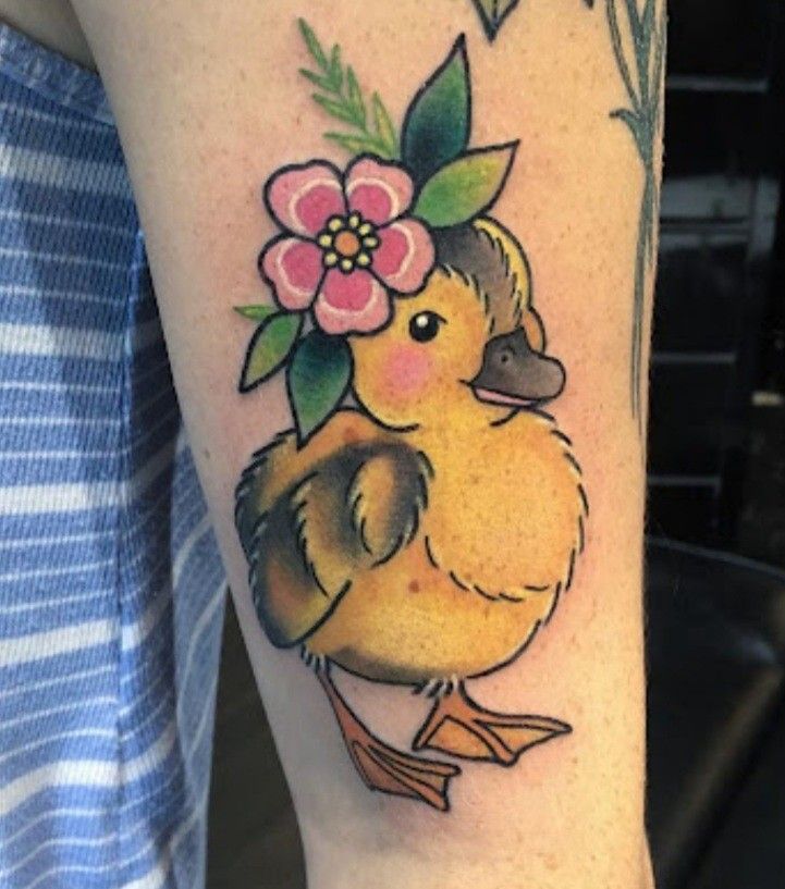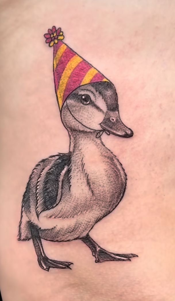 This design gives off pure good-vibes energy. It’s ideal if you love cute tattoos that feel positive and uplifting. Smaller placements work beautifully here, and the soft shading keeps it approachable for both men and women. If you’re after duck tattoo ideas that celebrate friendship or joy, this one has heart.