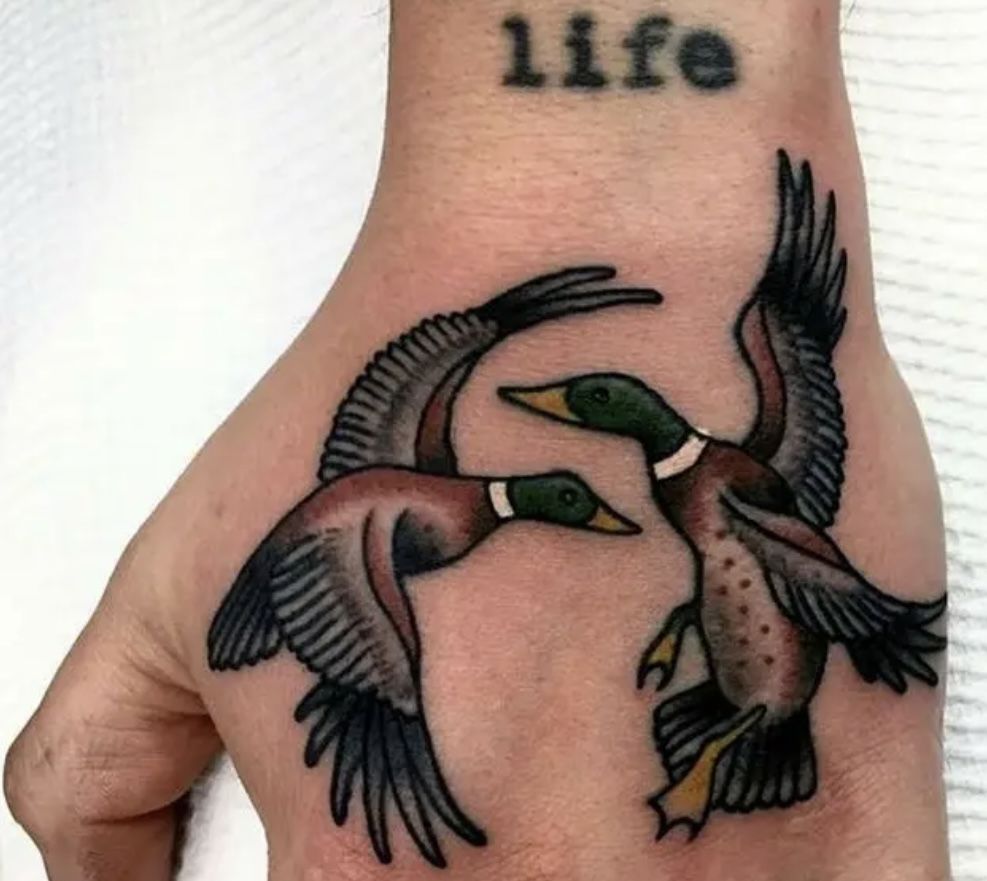 This design is perfect for men or couples who want matching ink with character. The bold lines mean it ages beautifully, which is why American traditional remains a favorite in 2025. Larger placements like the hand or forearm really let the wingspan shine. If you love classic tattoo ideas with movement and symbolism, Flying ducks bring both style and story.