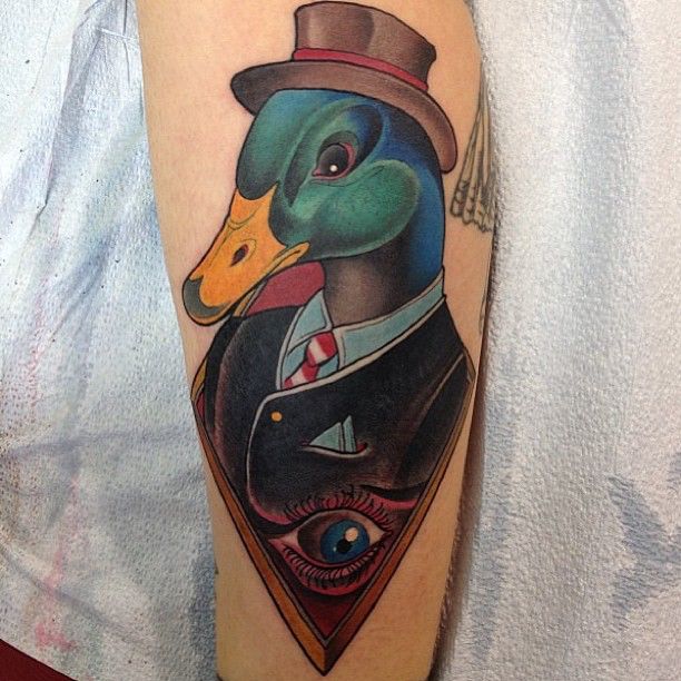 This is one of those larger, statement design pieces that thrives on forearms or calves. Compared to minimalist duck ideas, this one is theatrical and refined. It’s a fantastic option for men who want something distinguished yet playful, but stylish women can absolutely rock this dapper vibe too.