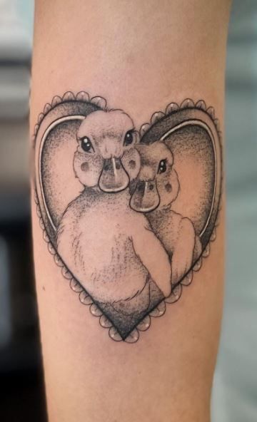 Two ducks nestled inside a heart—it’s romantic without being over-the-top. There’s something deeply sweet about the way they lean into each other. It feels intimate, almost protective, like a little symbol of partnership you carry with you. Among matching tattoo ideas, this one feels especially meaningful and mature.