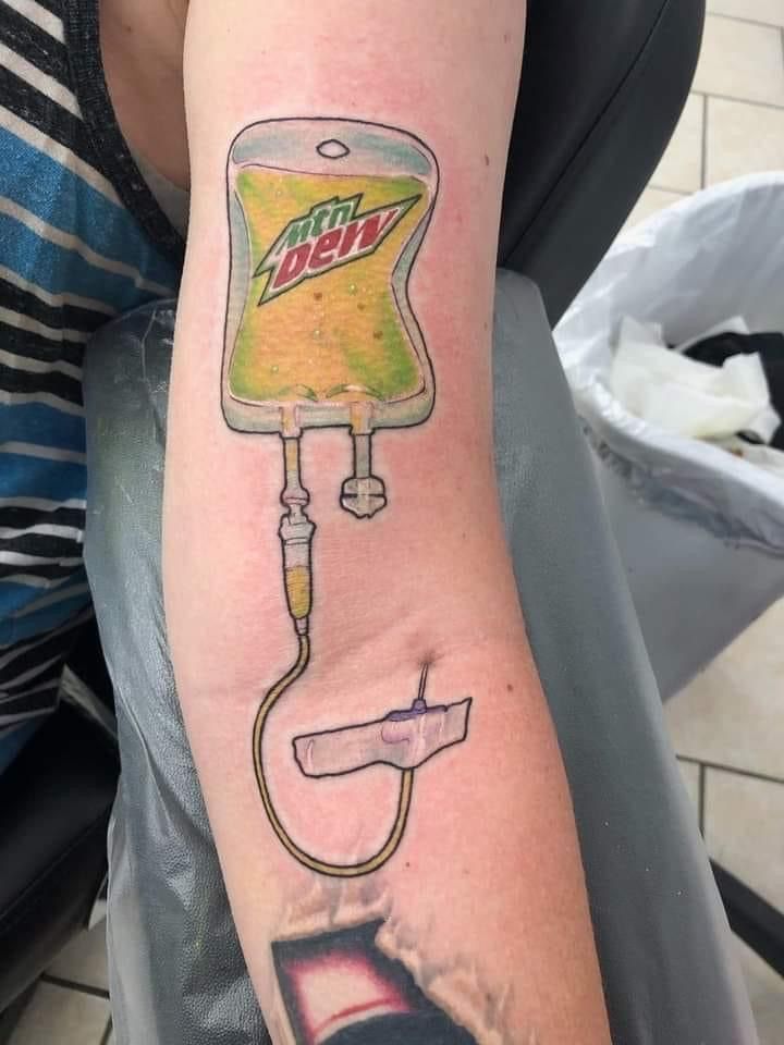Some tattoos make you laugh simply because they take something serious and flip it completely upside down. An IV bag filled with bright green soda feels like the ultimate tribute to late-night gaming sessions, road trips, and that slightly unhealthy love for sugary drinks. It’s ridiculous in the best possible way—like a visual joke about what truly keeps someone alive. The playful colors and familiar branding instantly grab attention, turning a medical-looking setup into pure humor.