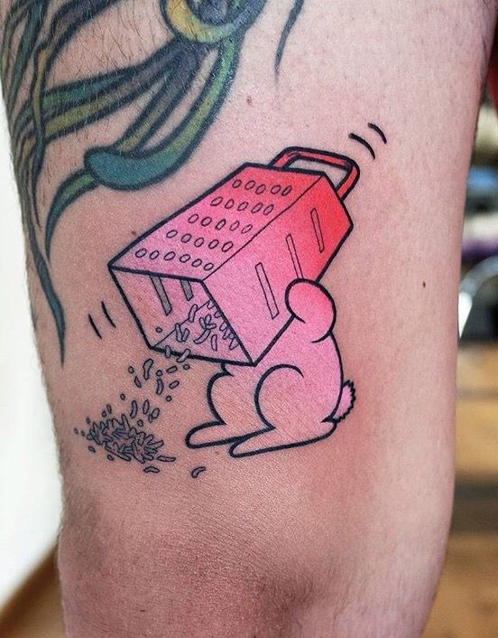 Few things are funnier than a visual joke that slowly reveals itself. At first glance, it looks like a harmless kitchen tool—but then you realize the poor little bunny is accidentally grating itself like cheese. The absurdity of the situation makes the tattoo feel like a dark cartoon gag frozen mid-action. It’s silly, slightly tragic, and oddly adorable all at once.