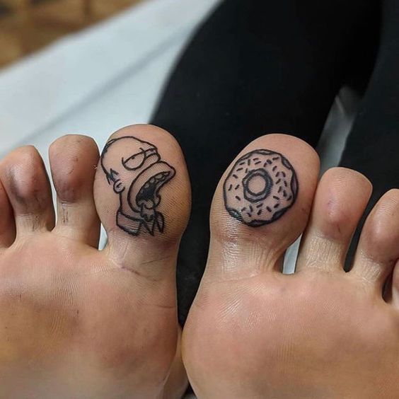 Sometimes tattoos are funny simply because they capture a perfectly absurd moment. Here, the classic donut-loving character reaches peak comedy as things take a very unfortunate turn. The tiny toe placement somehow makes the whole situation even funnier. It’s goofy, unexpected, and exactly the kind of tattoo that turns everyday life into a punchline.