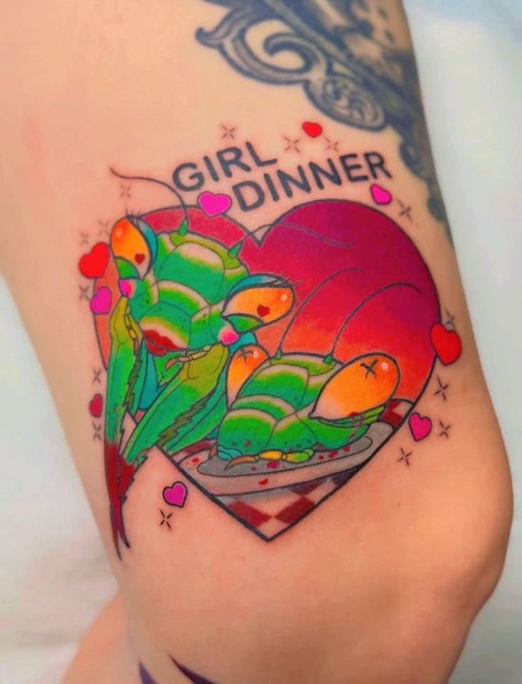 This tattoo turns dark humor into something strangely adorable. Two mantises enjoying “girl dinner” inside a heart frame are equal parts romantic and ridiculous. The bright colors, tiny hearts, and playful caption make it feel like a twisted Valentine’s card. It’s bold, vibrant, and just weird enough to make people laugh out loud when they notice the joke.