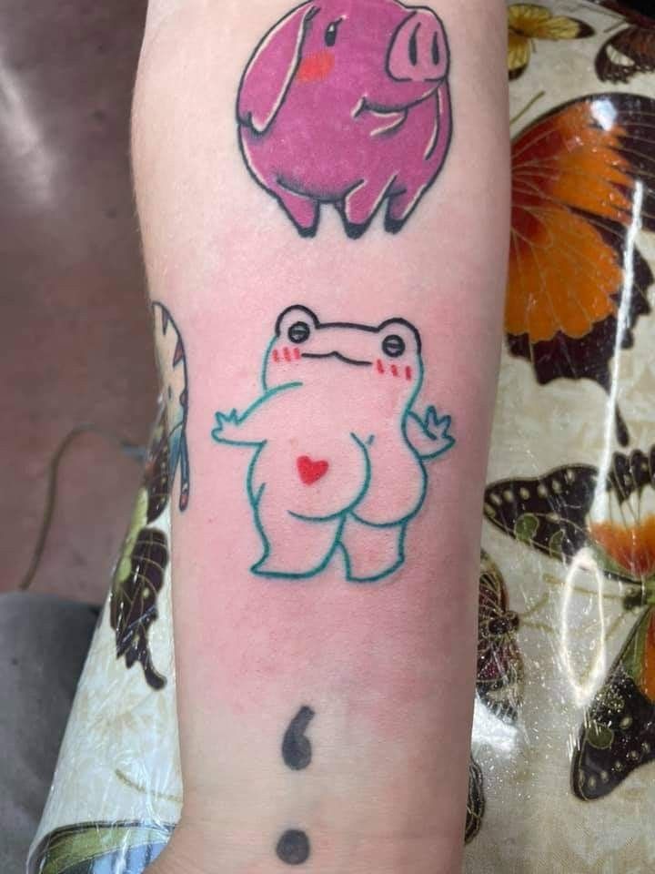 At first glance, this frog looks cute and harmless. But the tiny heart and cheeky pose quickly reveal the joke—and suddenly it becomes hilariously bold. Tattoos like this prove that humor doesn’t always have to shout. Sometimes it just quietly smirks. The soft pastel colors and cartoon style make the character look almost sweet, which only makes the punchline funnier.