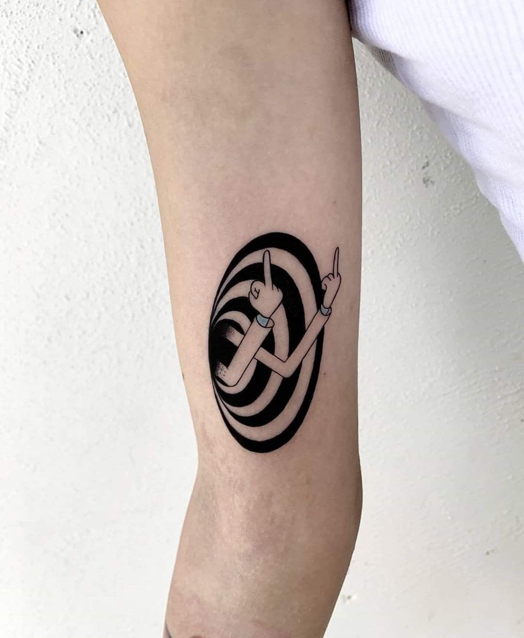 This tattoo is the visual equivalent of rolling your eyes and saying exactly what you think. The hypnotic spiral pulling inward while two hands throw up rebellious gestures is bold, graphic, and unapologetically cheeky. It’s the kind of humor that feels a little rebellious but is still playful enough to make people laugh instead of gasp.
