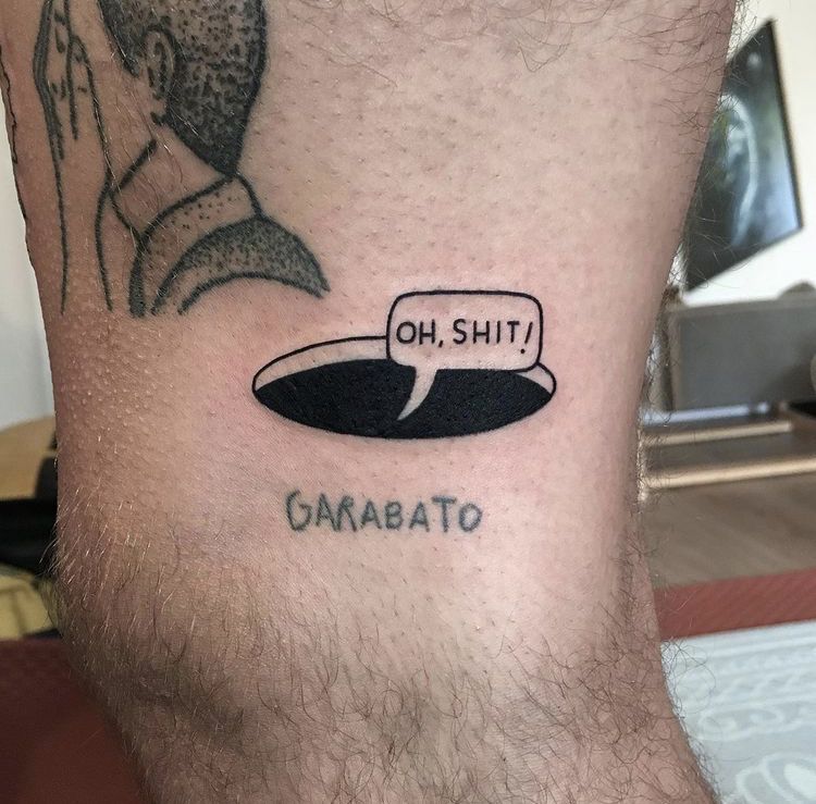 Some tattoos feel like a punchline pulled straight out of a classic cartoon scene. This simple black hole with a speech bubble saying “oh, shit!” captures that exact moment when a character realizes they’ve made a terrible decision. It’s minimal, dramatic, and hilariously relatable. The humor comes from the anticipation—you know something chaotic is about to happen, and the tattoo freezes that split second of realization.