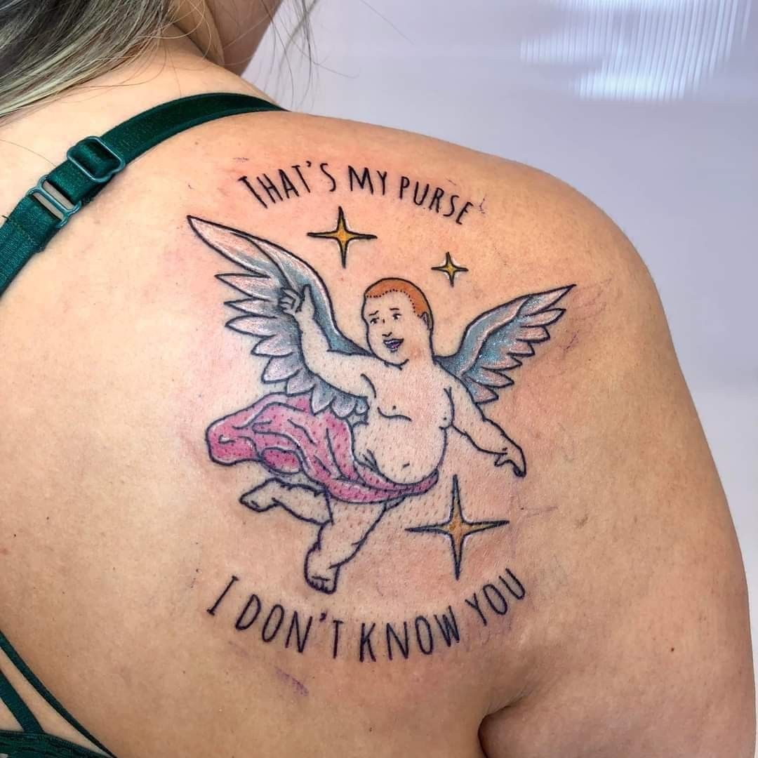 This tattoo turns a classic cherub illustration into a hilarious pop culture moment. The angel floats sweetly with sparkling stars, but the bold quote above and below adds a completely unexpected twist. It’s nostalgic, sarcastic, and oddly wholesome all at once. Tattoos like this feel like inside jokes for people who recognize the reference.