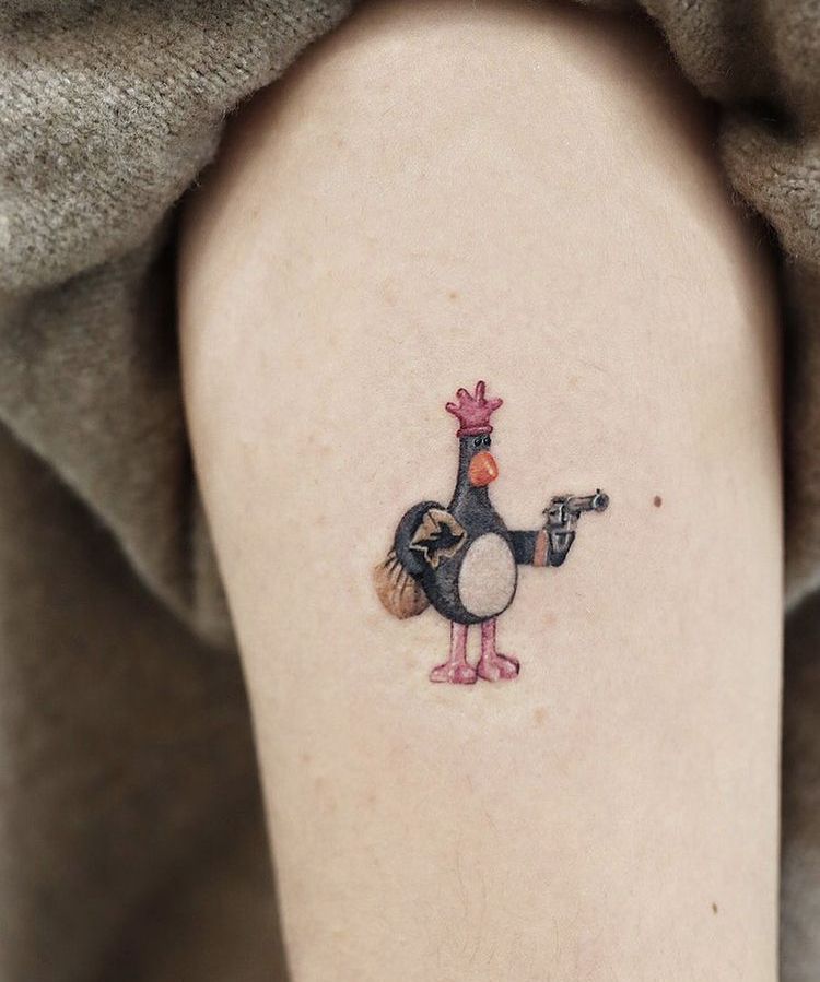 This little chicken might be tiny, but the attitude is enormous. The absurd contrast between its innocent cartoon look and the tiny weapon it’s holding creates that perfect awkward humor that makes you laugh twice. It’s unexpected, quirky, and wonderfully strange—exactly what a funny tattoo should be. Pieces like this feel almost like secret jokes, something you notice and immediately want to show your friends.