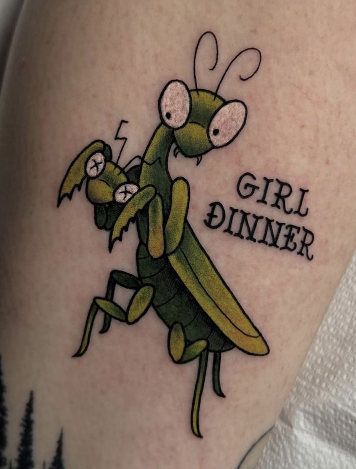 Dark humor can be strangely charming, and this mantis tattoo absolutely nails it. The big innocent bug eyes and the bold “girl dinner” caption turn a slightly morbid biological fact into a playful visual joke. It’s one of those designs that people notice, pause for a second, and then burst out laughing. Funny tattoos like this often work best when they feel a little weird and unexpected.