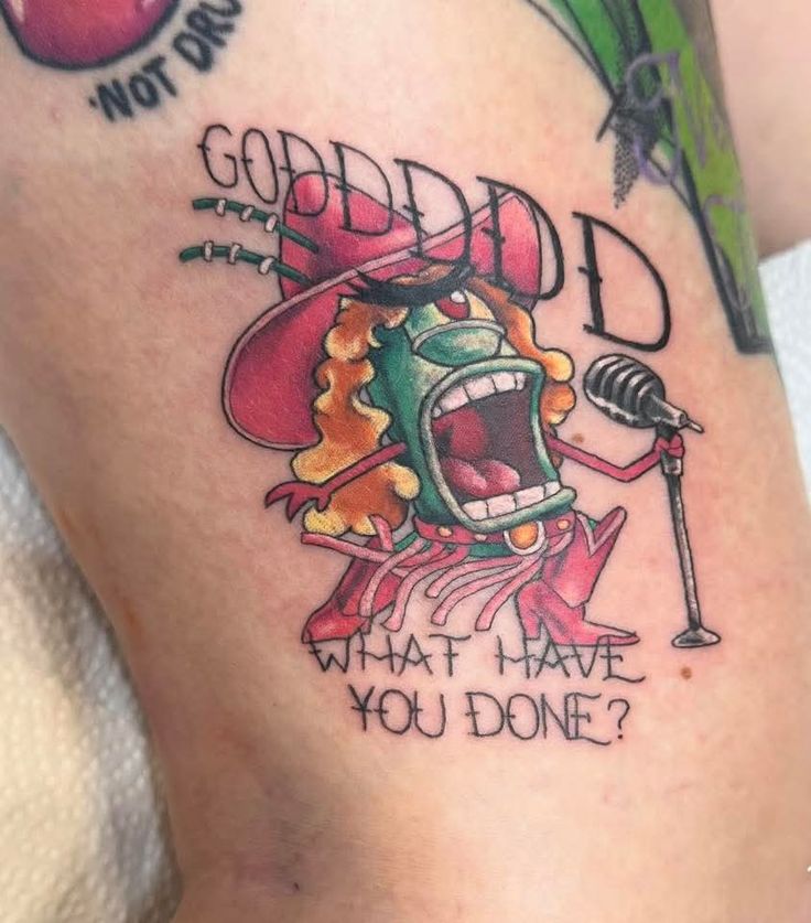 Few things are funnier than dramatic cartoon panic. This screaming rock star creature belting into a microphone while shouting “What have you done?” feels like the ultimate tattoo regret joke. The exaggerated expression and wild energy make the entire design feel loud, chaotic, and hilariously theatrical.