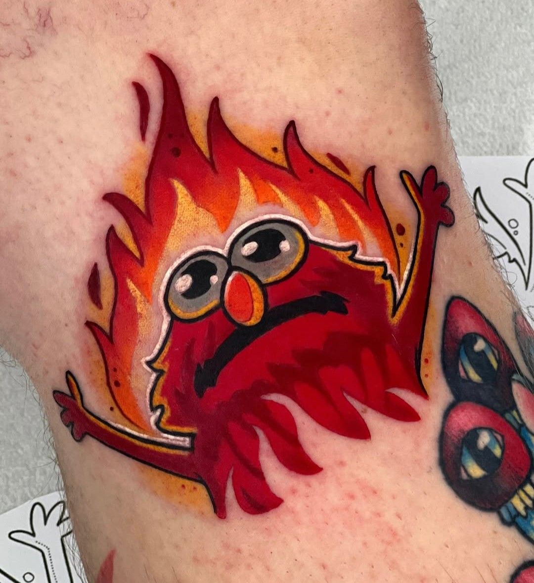 Sometimes the funniest tattoos are the ones that feel like a cartoon disaster frozen in time. This fiery red character with wide, terrified eyes looks like he just realized he made a very bad decision. The exaggerated expression and wild flames turn the whole moment into pure comedy. It’s loud, chaotic, and oddly adorable all at once—exactly the kind of humor that makes people laugh when they notice it for the first time.