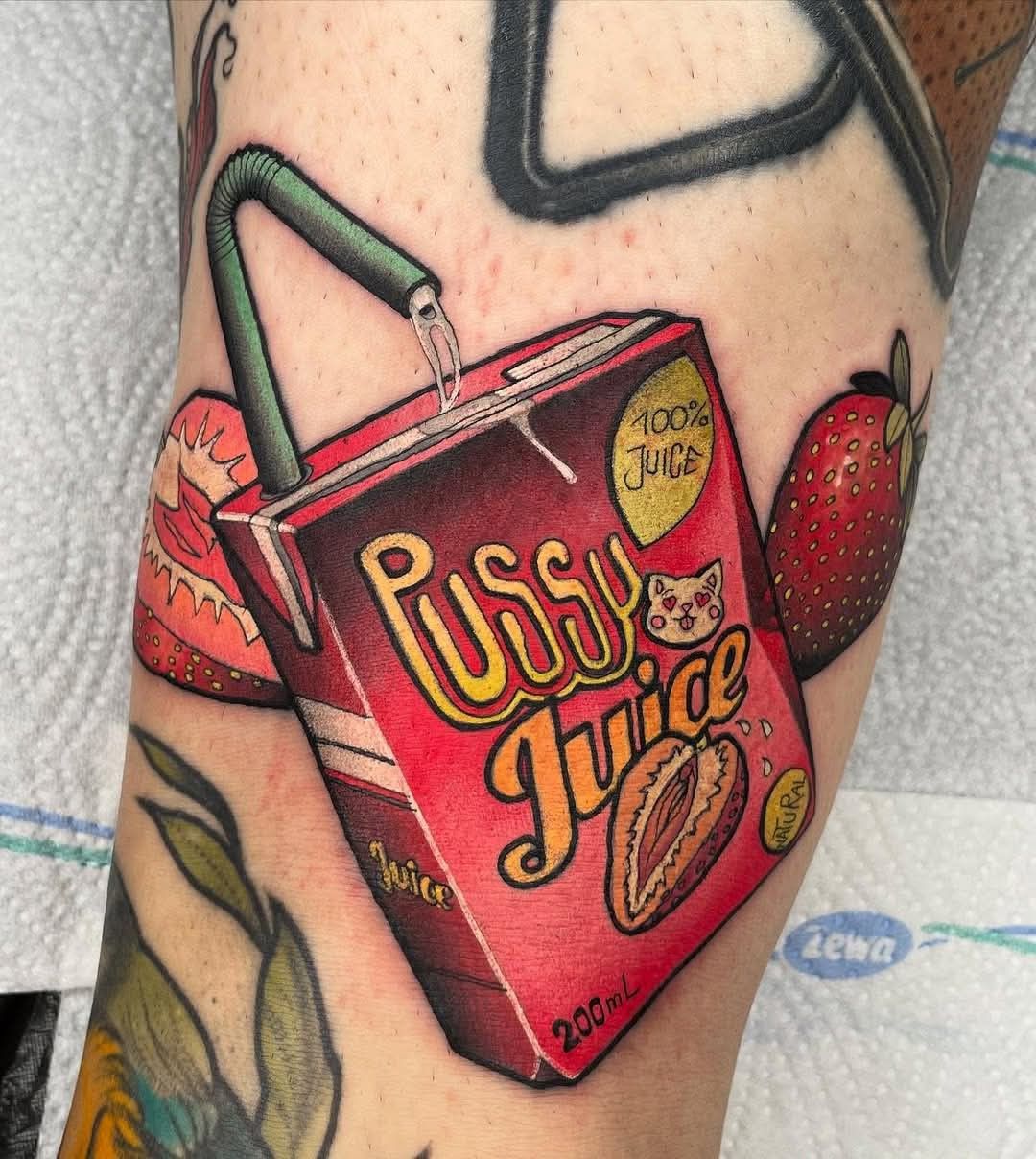 At first glance, it looks like a harmless juice box—bright, nostalgic, almost sweet. But then your eyes land on the label, and suddenly the joke clicks. It’s cheeky, a little outrageous, and undeniably funny. Tattoos like this feel like a wink between friends, the kind of inside joke you carry everywhere. The vibrant reds and playful fruit details make it pop visually, while the humor keeps it unforgettable.