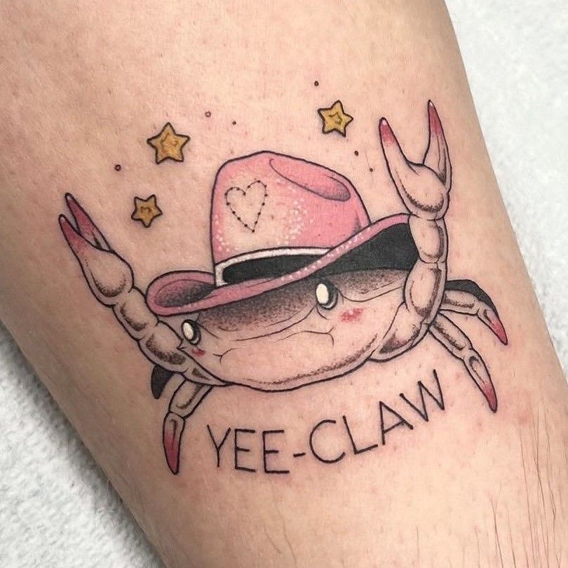 If there’s one thing guaranteed to make people smile, it’s a crab wearing a pink cowboy hat. The phrase “Yee-Claw” seals the deal—equal parts adorable and ridiculous. Tattoos like this feel playful and carefree, like a tiny celebration of goofy humor. The stars and soft colors add a little dreamy charm that makes the whole design feel more whimsical than silly.