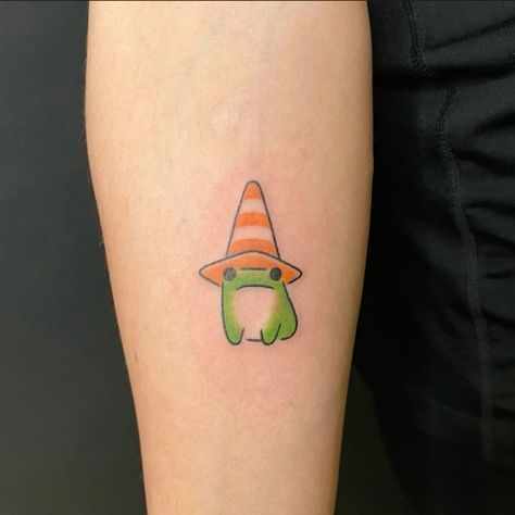 A tiny frog wearing a traffic cone hat might be one of the most random tattoo concepts imaginable—and that’s exactly why it’s so funny. The little character looks proud and slightly confused, like he accidentally ended up in charge of directing traffic. It’s adorable, absurd, and impossible not to smile at.