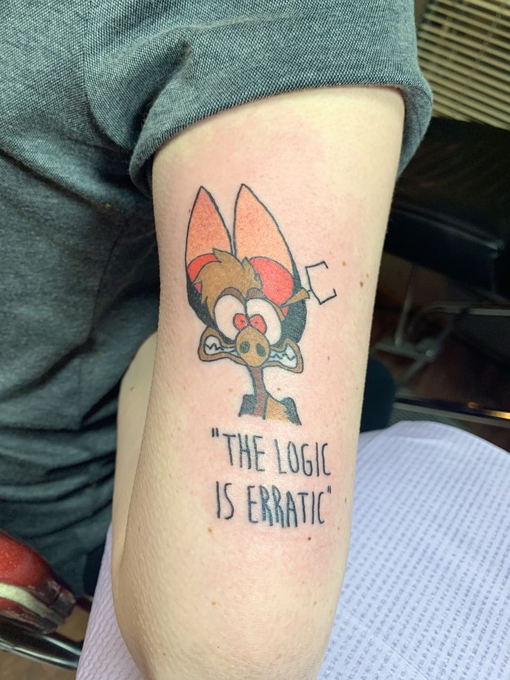 This tattoo captures the chaotic energy of a cartoon character having a complete mental breakdown. The wide eyes, twitchy expression, and caption underneath perfectly sum up those moments when nothing makes sense anymore. It’s the kind of humor that feels strangely comforting because everyone has days where logic truly is “erratic.”