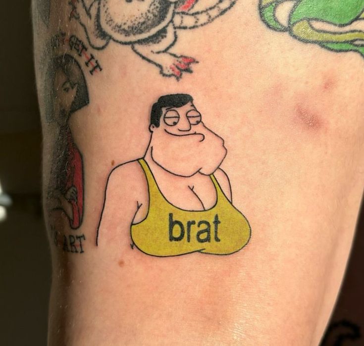 There’s something oddly hilarious about turning a cartoon character into a fashion statement. The calm, slightly smug expression paired with a bold “brat” tank top makes this tattoo feel like a tiny rebellious poster from a parallel universe. It’s playful, sarcastic, and just self-aware enough to be funny without trying too hard. Tattoos like this work because they blend pop culture with just the right amount of absurd attitude.
