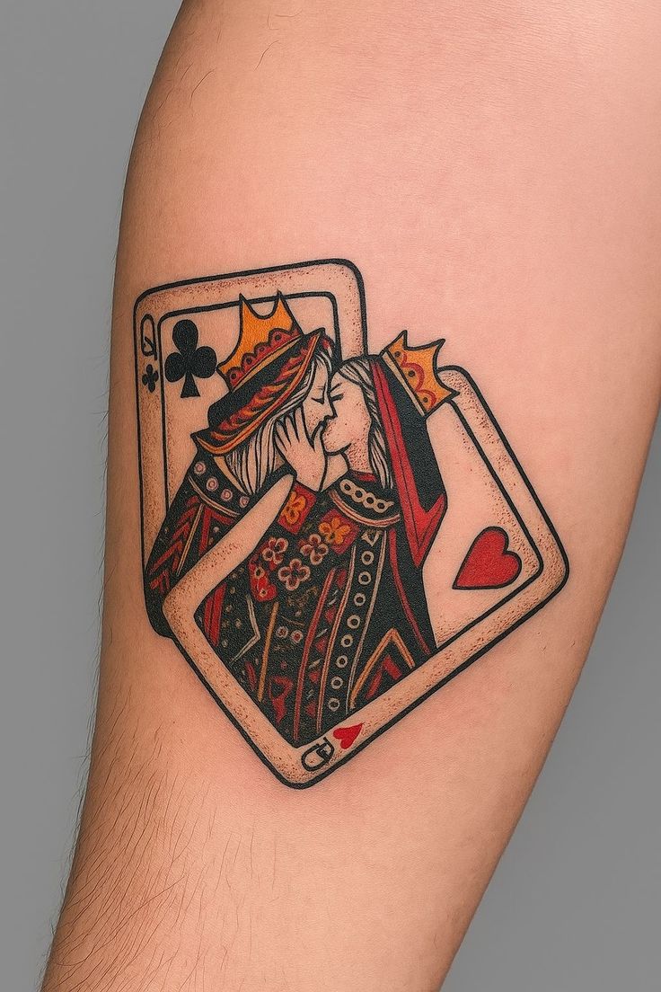 Playing cards have always been a classic tattoo motif, but this design adds a hilarious twist. Instead of a traditional royal portrait, the king and queen cards lean in for a sneaky kiss. It feels like a scandalous little story hiding in plain sight—one that turns a familiar symbol into a playful joke.