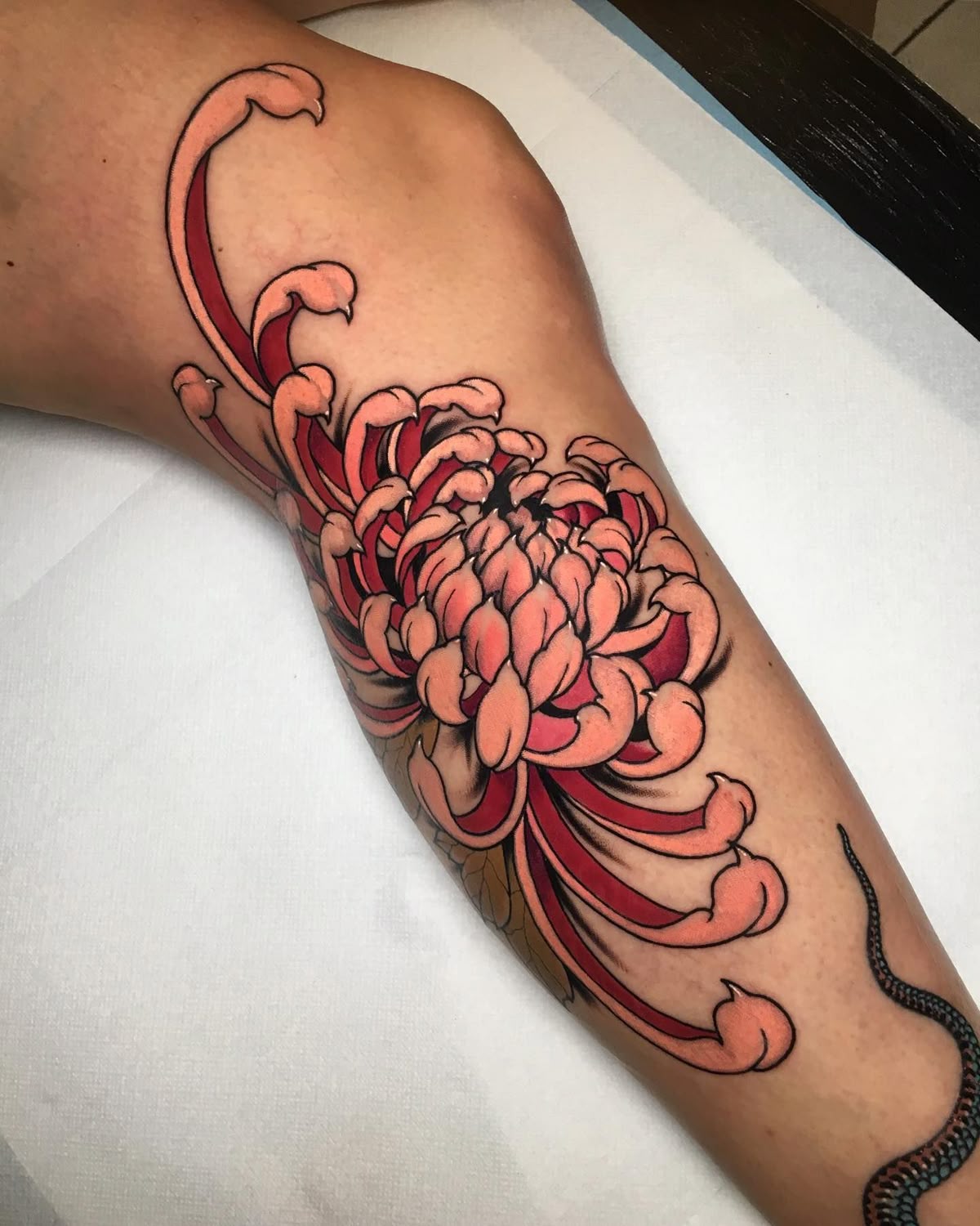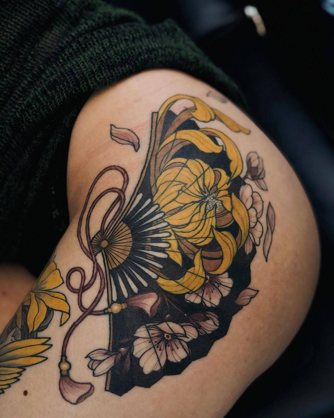 This tattoo feels like a story pulled straight from traditional Japanese art. The chrysanthemum paired with the fan brings a sense of heritage, ceremony, and quiet drama. It feels thoughtful and layered, like something chosen with intention rather than impulse.