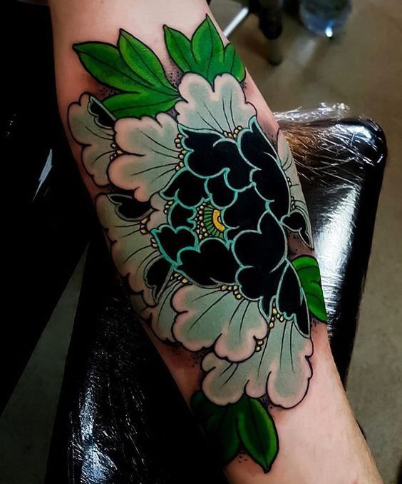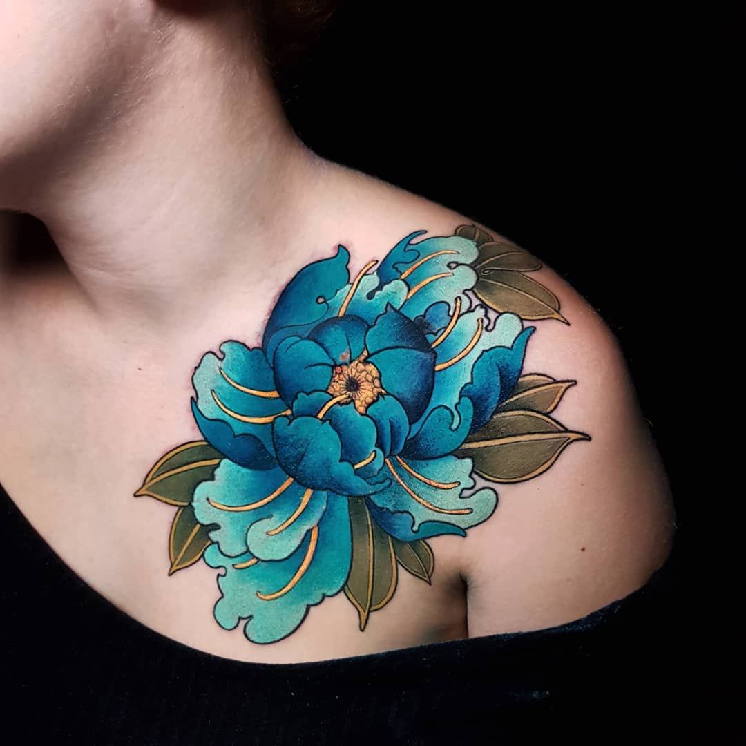 This tattoo feels artistic and intentional, like a blend of fabric design and fine art. The teal peony stands out against a patterned backdrop, giving it depth and texture that feels both modern and traditional.