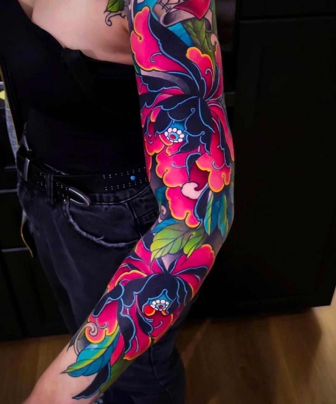 A design sleeve like this is perfect for those ready to commit to large-scale art. Popular in current ideas, it suits women who love expressive color and movement. The balanced composition keeps it visually rich without feeling overwhelming.