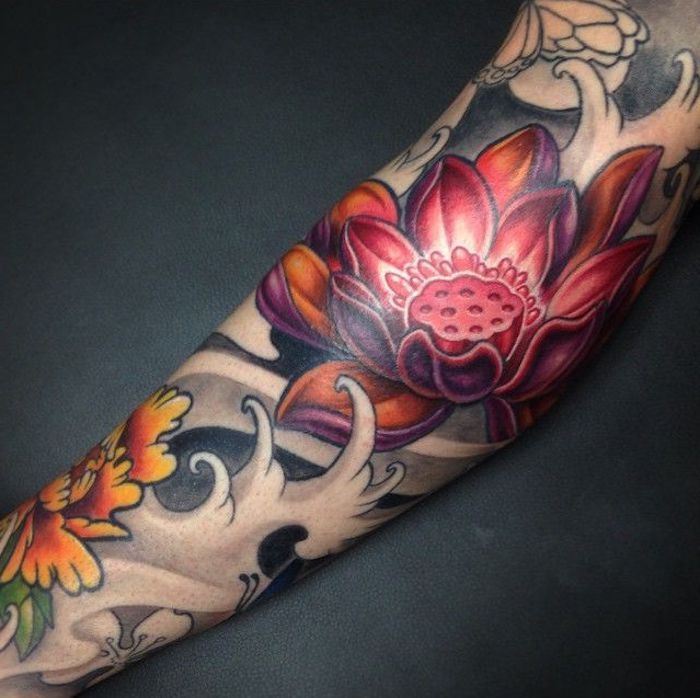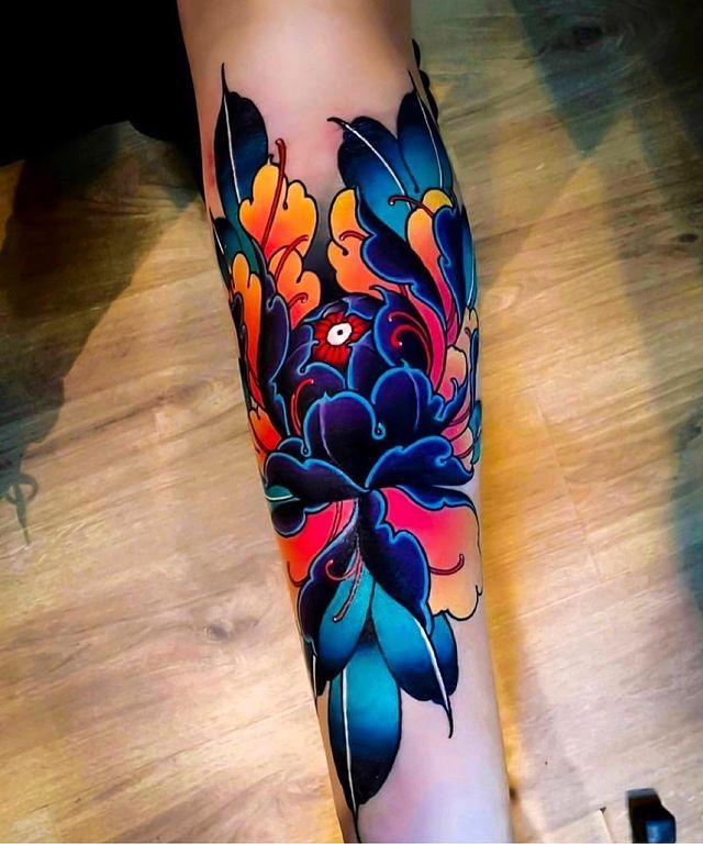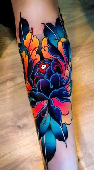 If you’re drawn to bold ideas and vibrant color, this tattoo delivers. It’s ideal for the lower leg or arm, where the shape allows the petals to really breathe. This style is especially popular in modern traditional work, blending classic drawing techniques with high-impact color choices.