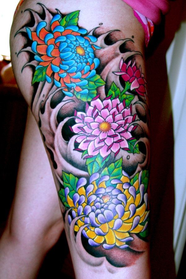 This is the kind of tattoo that turns heads without trying. Saturated color, confident lines, and layered flowers create a story that feels bold and joyful at the same time. It has that unmistakable “I chose this for me” energy—playful, artistic, and fearless.