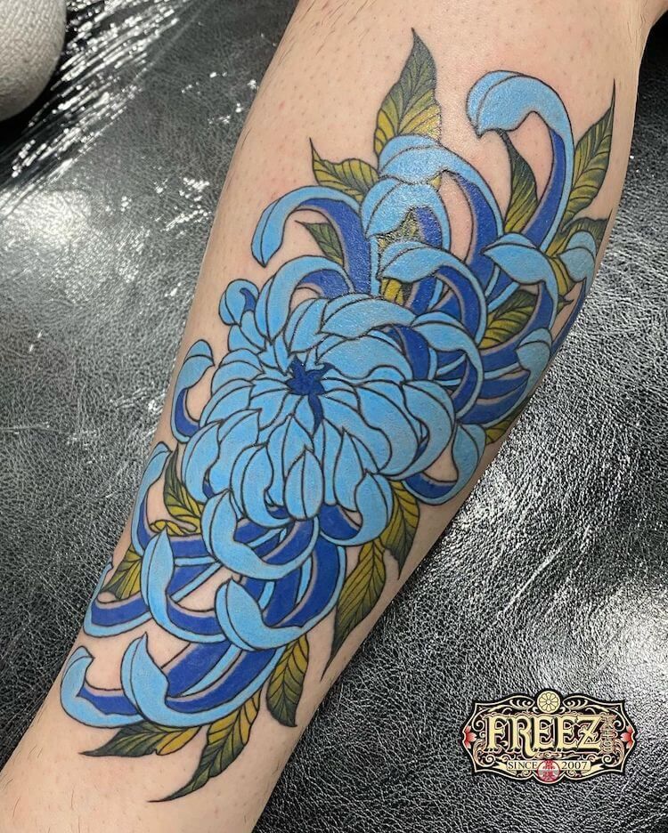 This design feels energetic and modern, almost like the flower is in motion. The cool blue petals twist and unfold with confidence, giving the tattoo a fresh, contemporary edge while still honoring traditional forms.