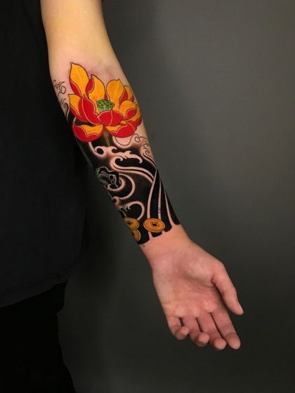This tattoo is ideal for the lower leg or leg, where the natural shape of the body enhances the flow. It suits people who appreciate traditional Japanese art but want something softer and more romantic. The color palette is forgiving on different skin tones and looks especially beautiful when you want a design that feels expressive without being overwhelming.