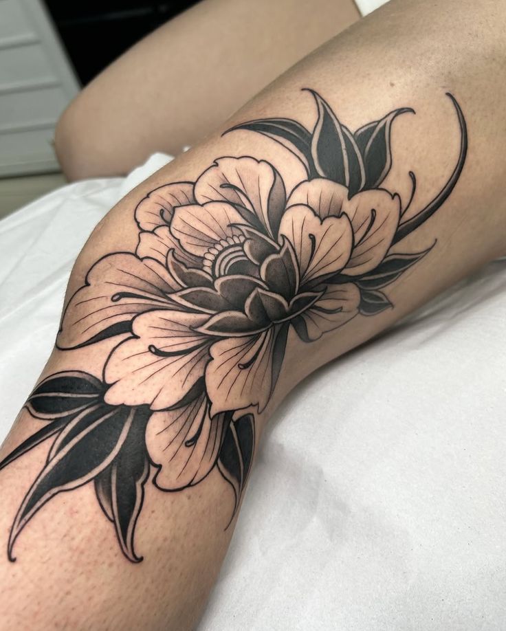 This piece works especially well on the leg, where the elongated shape enhances the flow of the petals. It’s ideal for people drawn to dark, expressive color and emotional depth. A beautiful choice if you want your tattoo to feel powerful and personal.
