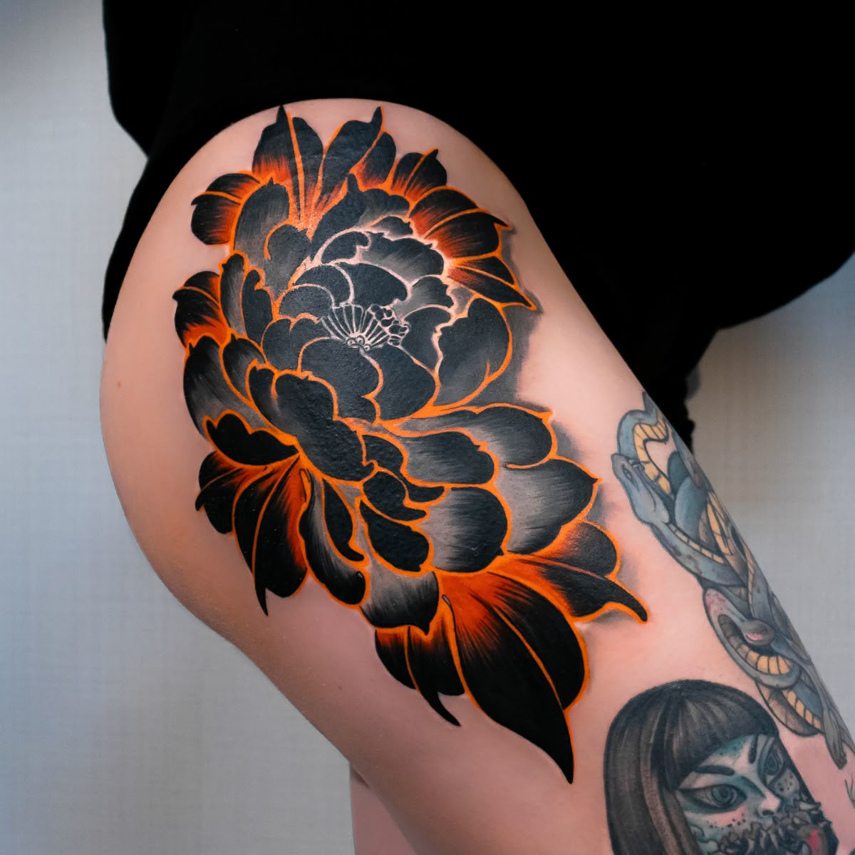 What makes this design special is the balance between shadow and glow. It works beautifully on the arm or shoulder, especially for those drawn to black and grey design styles with a modern twist. The bold contrast holds up well over time, making it a smart choice for men or women who want art that ages gracefully without losing its edge.
