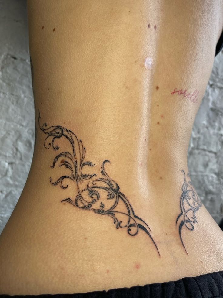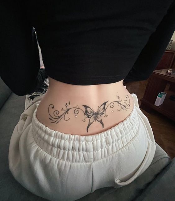 This is the kind of lower back tattoo that feels feminine with a little fantasy mixed in. The Butterfly at the center gives it softness, while the swirling details stretching outward add elegance and movement that make the whole piece feel more elevated. It almost wears like a piece of lingerie or delicate jewelry across the skin, which is why it feels so visually rich without being overly heavy. For women who want something pretty but still full of personality, this design strikes such a flattering middle ground between romantic and dramatic.