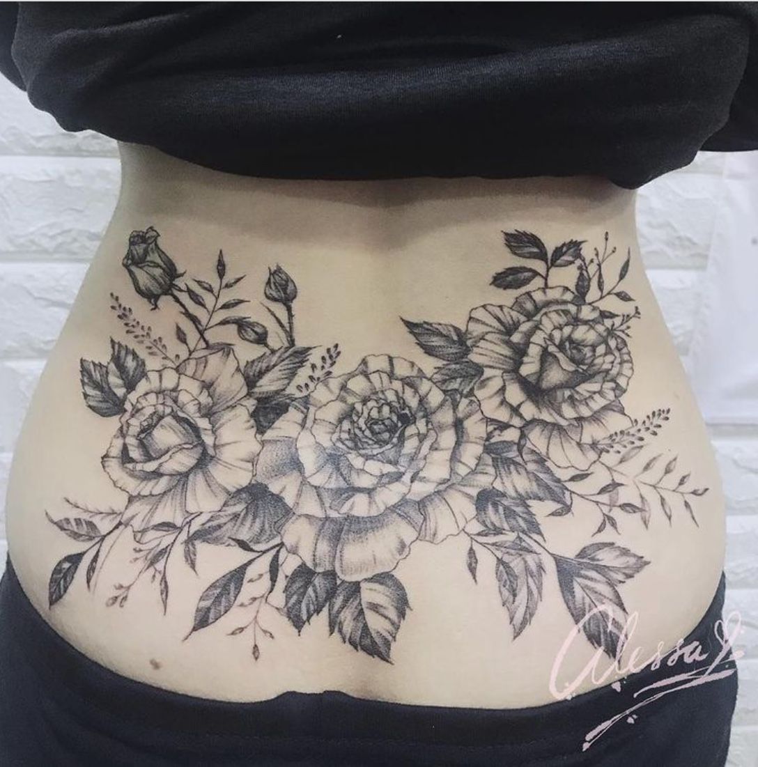 12. Full Bloom Floral Lower Back Tattoo