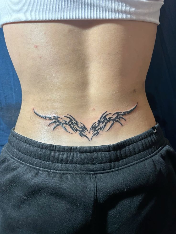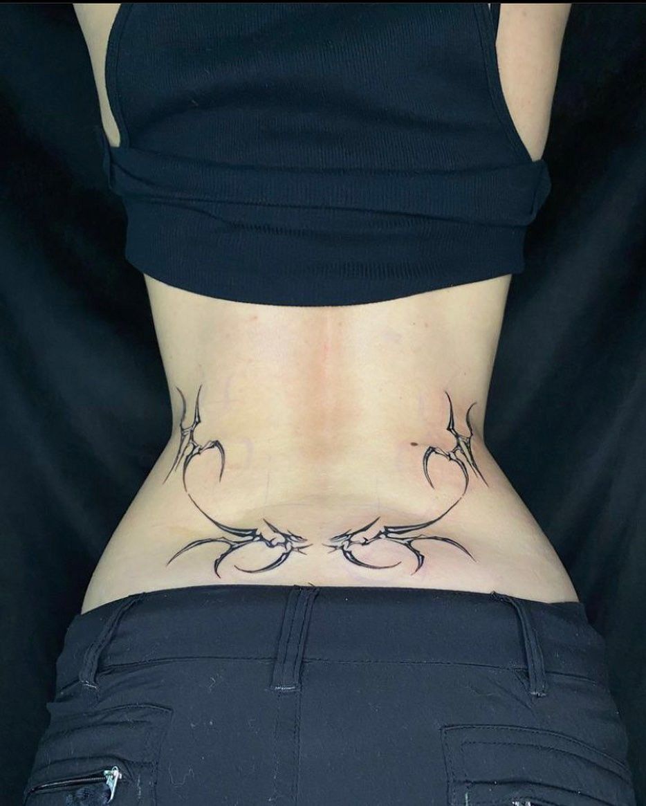 Now this one has an edge. The sharp mirrored lines create a look that feels sleek, fierce, and a little futuristic, like body art with a pulse. It doesn’t try to be soft or sweet, and honestly, that’s the magic. This is the sort of lower back tattoo that changes the energy of your whole look the second it peeks above a waistband. It feels bold, body-aware, and very intentional—perfect for women who want their ink to make a modern statement instead of leaning romantic or nostalgic. There’s a beautiful tension here between symmetry and wildness that makes it incredibly striking.